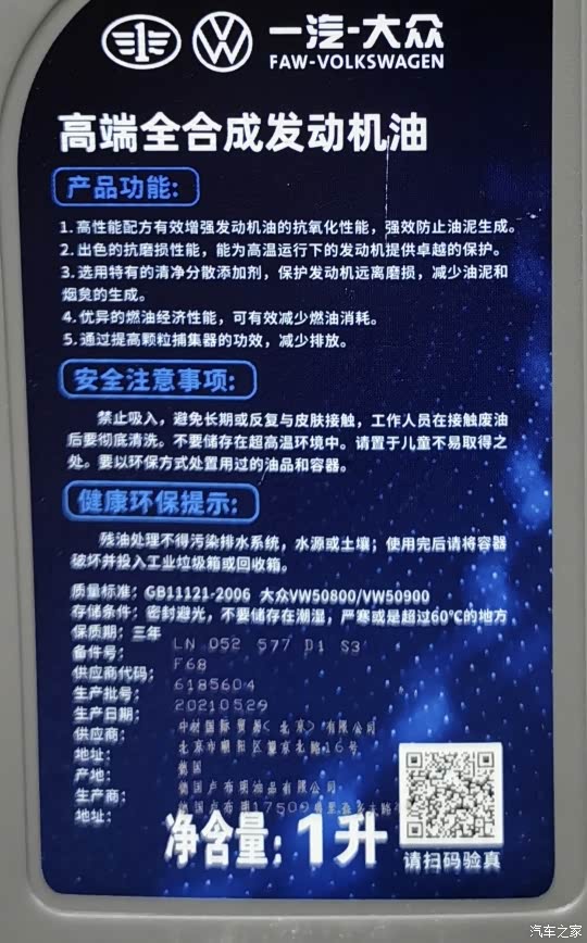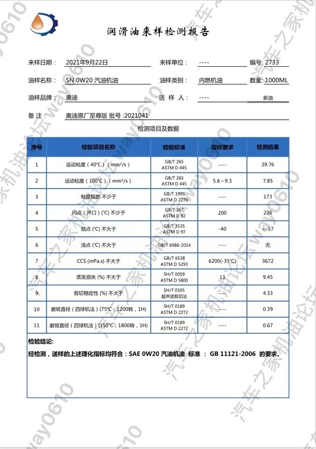 一汽大众高端全合成跟这款奥迪高性能是一样的配方,实测数据非常接近