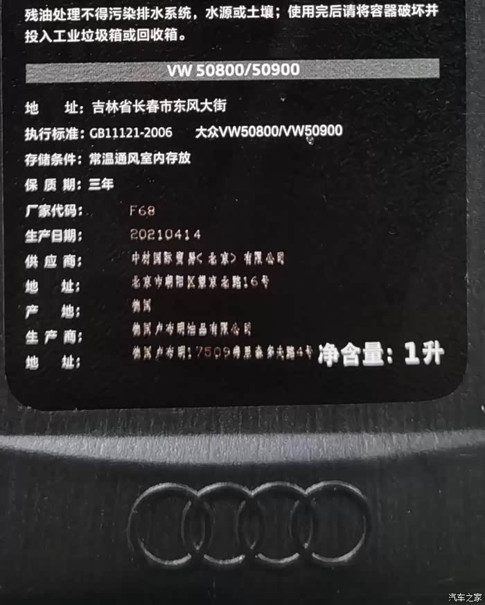 德国卢布明产的这款油跟奥迪原厂至尊版是一模一样的,(国内很多4S店的德联产不清楚是否一样),我们来对比一下。