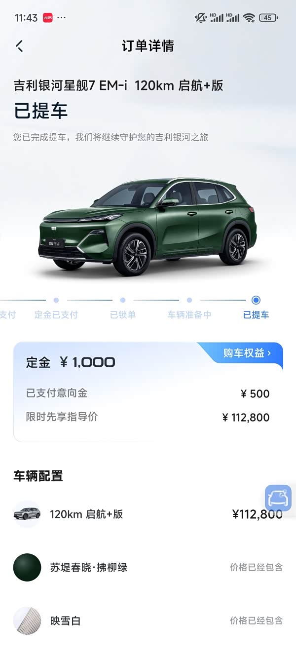 11.28小程序小定,12.4店内销售通知车到了,12.6上市优惠一万(直到这个时候我才下定决心买它),12.8店内支付全款(买车前用了网贷,结清了,但是厂家贷款还是没给我过,只能全款买)