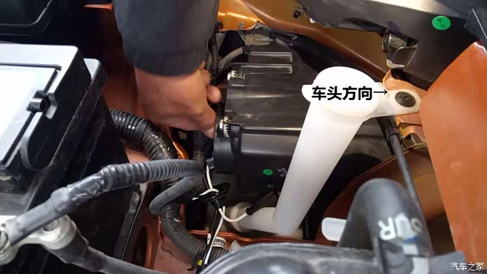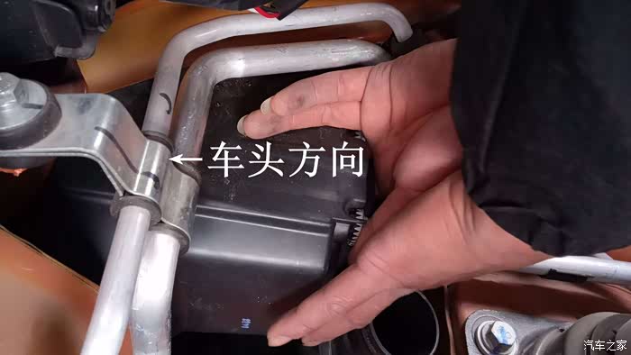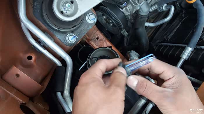 然后开始安装副驾驶一侧的大灯灯泡。这部分发动机舱有空调管道布线,空气滤清器、发动机皮带等等,空隙小得多,很不好拆换大灯灯泡,至少要把空气滤清器整个拿下来才勉强方便操作。