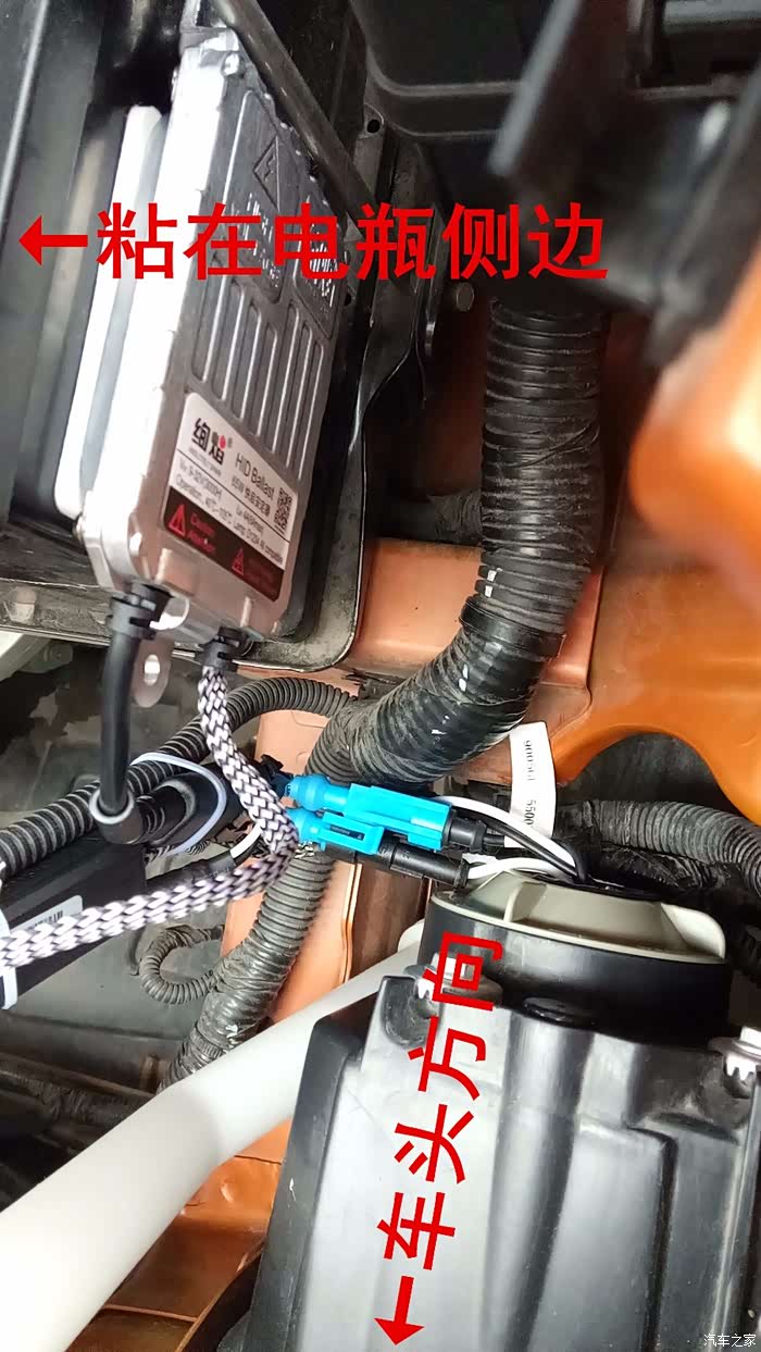 稳压器和连接线一起绑在电瓶线上,薄薄的安定器粘在电瓶侧边。Very quickly~