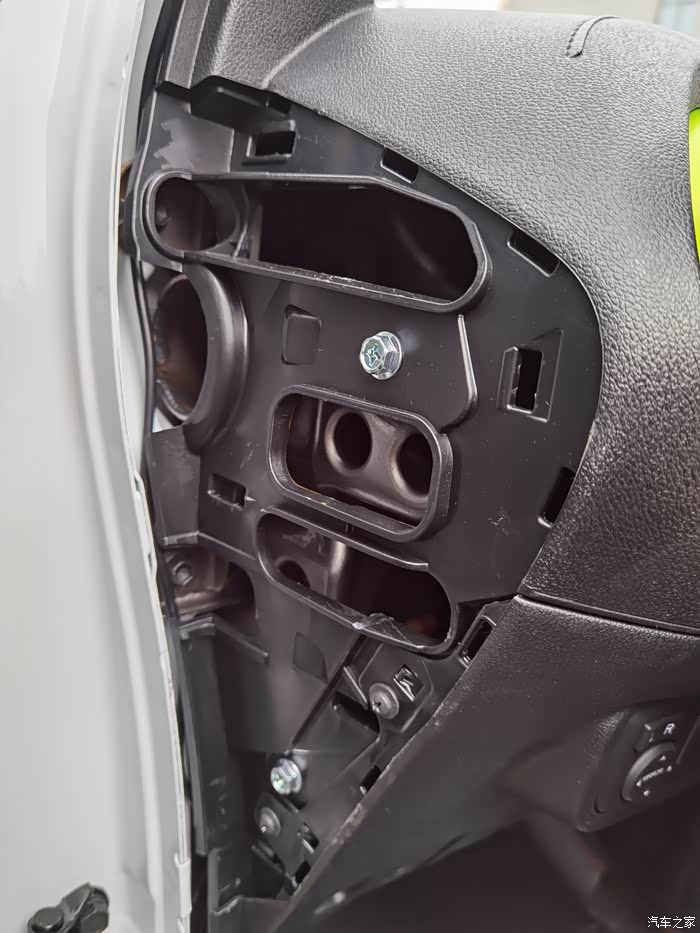 回到前面驾驶室,安装降压线,先用撬棒弄开侧面装饰板,把这2颗螺丝下了,和底部一个螺母拆了,然后用力拽开方向盘下面的装饰板