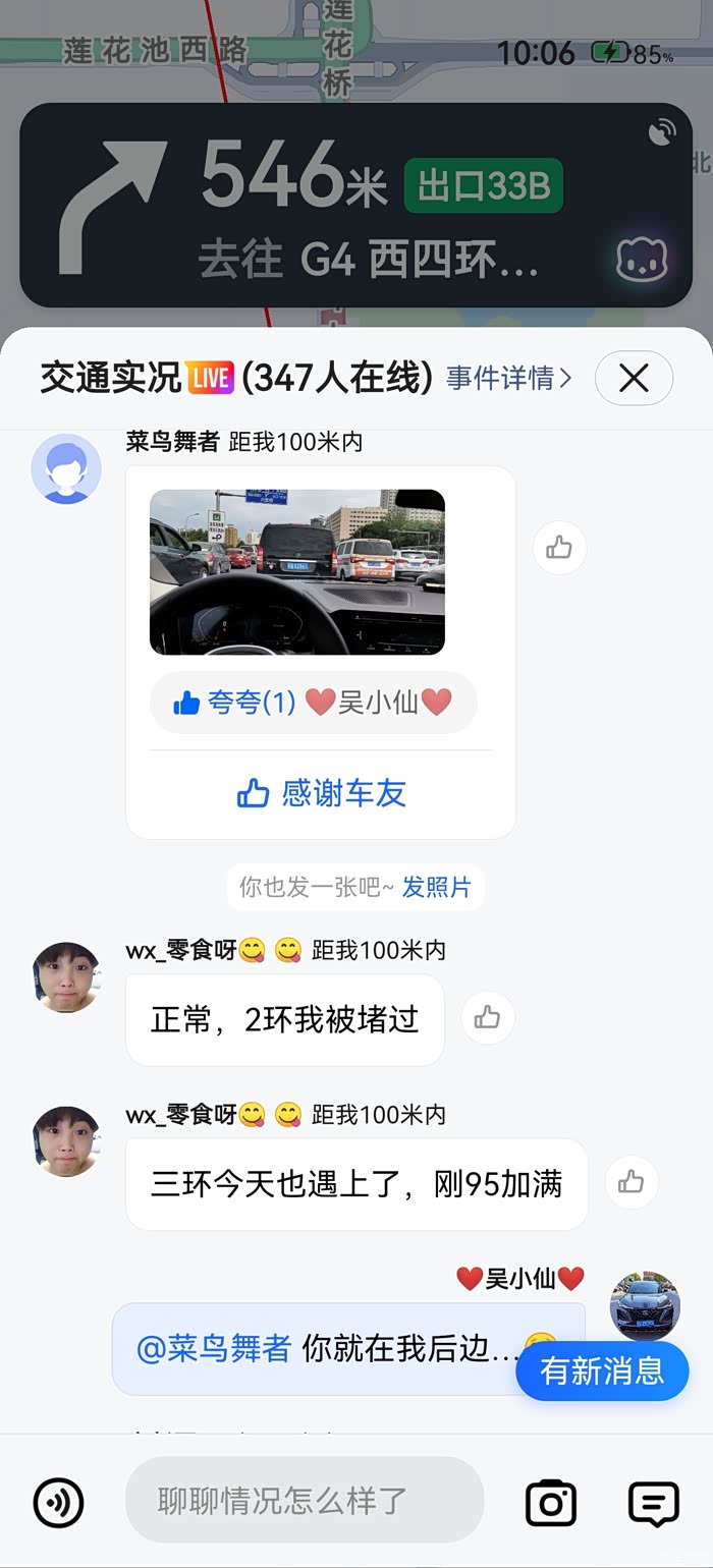 上午去海边办事,路过西三环接完人走到六里桥赶上交通管制了,原地堵车半个小时,打开手机地图看看前方车友发来的路况信息一看,居然看到我这车的照片,原来是后边车那车的车主拍的,这不巧了吗…