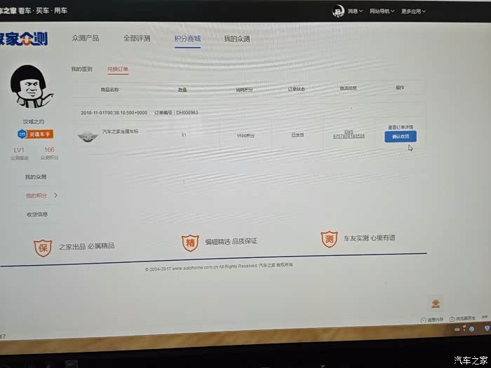 自注册汽车之家帐号以来,几乎天天登录之家网站,学习看车买车用车知识,受益颇多。好多车友的车车都有一个“汽车之家”标识,很是羡慕。本人懒散,不喜用脑费心,虽然天南海北游历了不少祖国大好河山与人文景观,也喜欢总结一些爱车用车体会,但均因不喜欢用心拍照、码文字和水平有限而没有发贴,所以很长时间攒不到足够的 工分来兑换车标。好吧!那就老老实实动动手点点鼠标签到做任务挣工分吧。终于,不懈的努力与坚持,终于积攒了足够的众测积分,兑换了一个“汽车之家”金属车标,呵呵,车车终于有了身份标识。