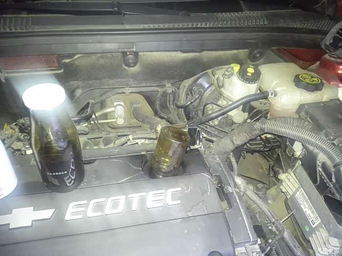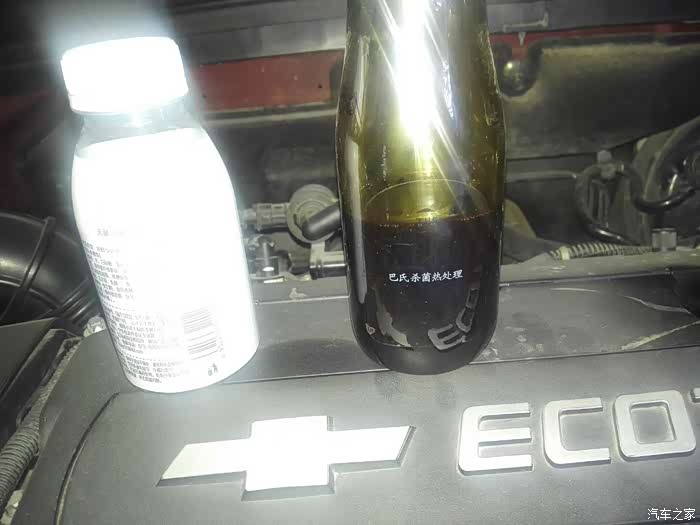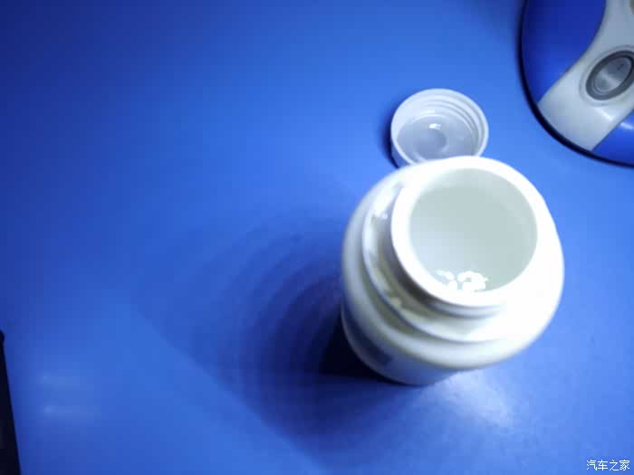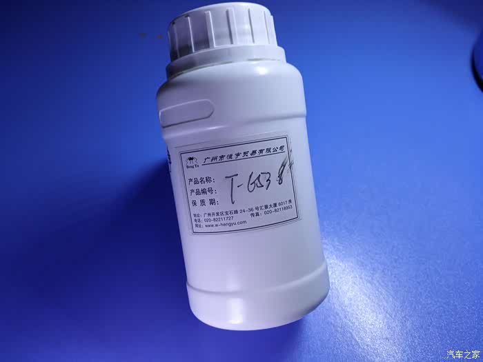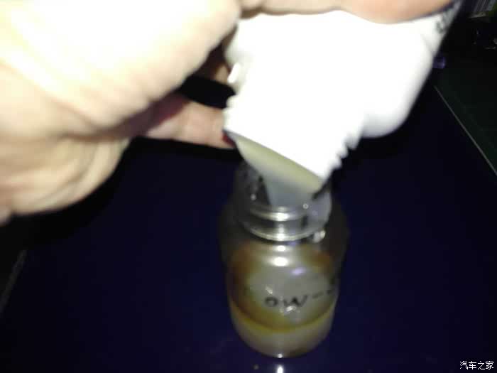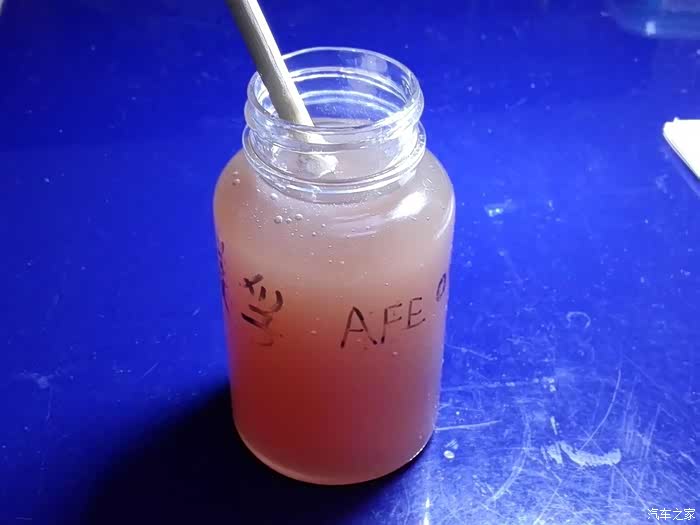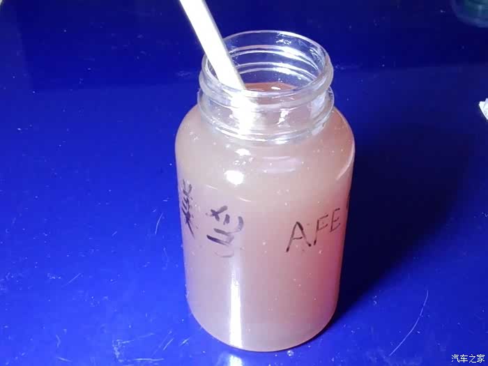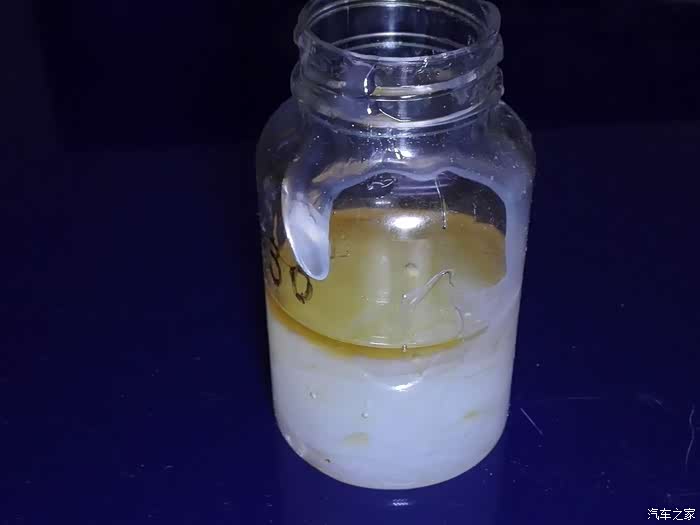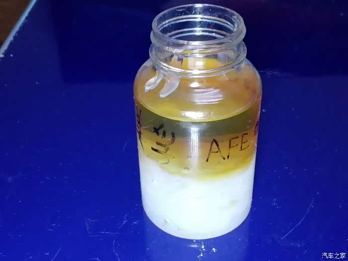准备按机油量的2%添加,倒了约80ml到瓶中马上沉底,看来比重比较大。瓶中浮在上面的黄色液体是机油。