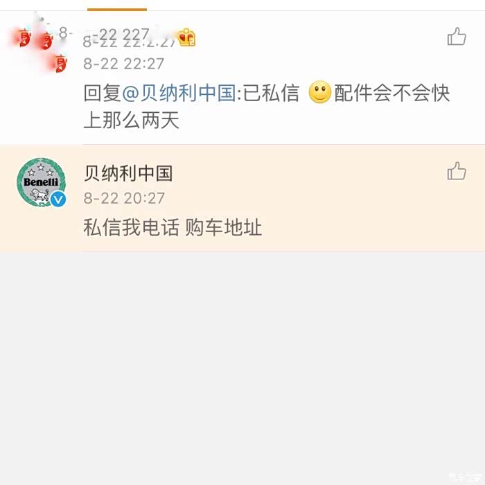 如图,发了个微博艾特 贝纳利中国 分分钟得到关注和服务(这钱江和贝纳利到底是一家还是两家?这服务态度极与极啊