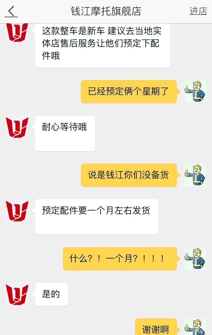首先找到钱江旗舰的客服,瞧瞧这回复,卧槽,没弄懂这发货时间的,还以为我买的大贸进口货呢。好好一钱江国产怎么配件时间向国外接轨啊?!