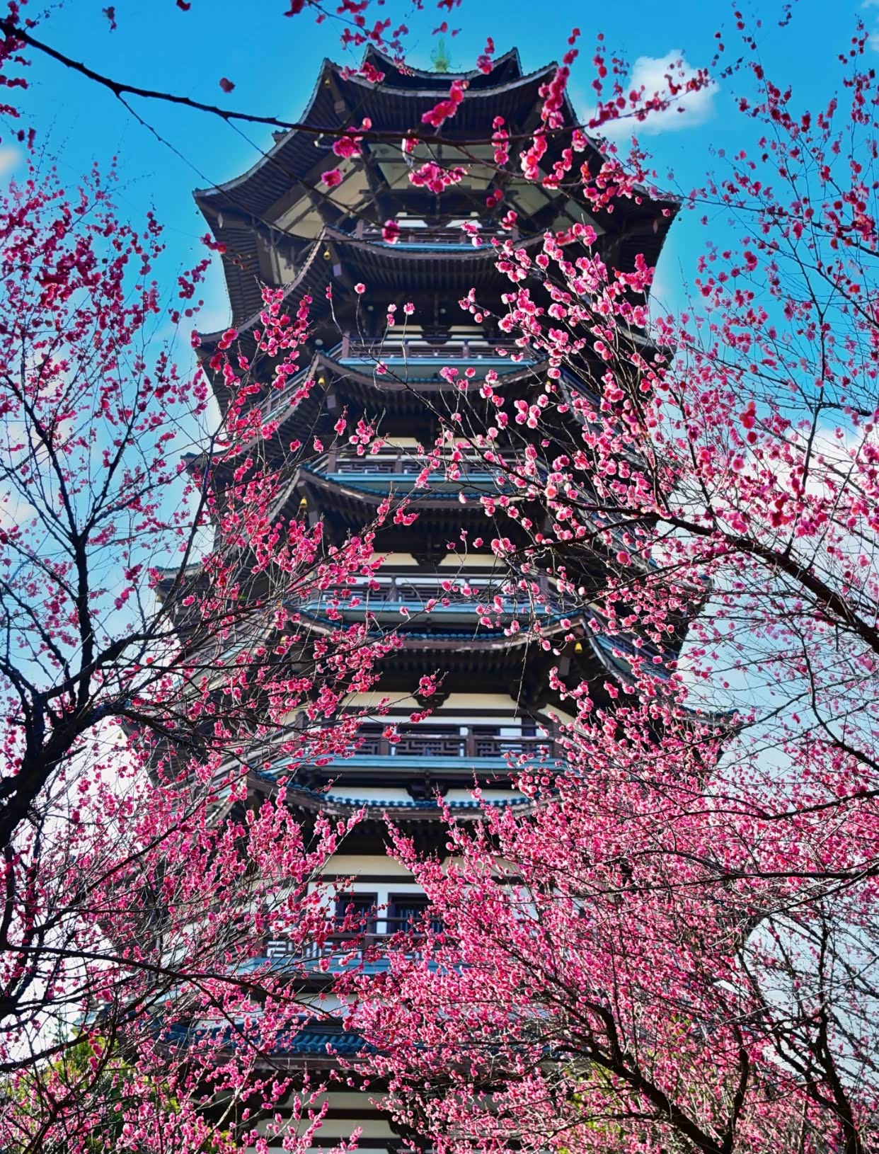 1. 白鹭塔两侧的梅花林:这里是C位!梅花和古塔同框,有一种穿越的氛围感,一定要拍!