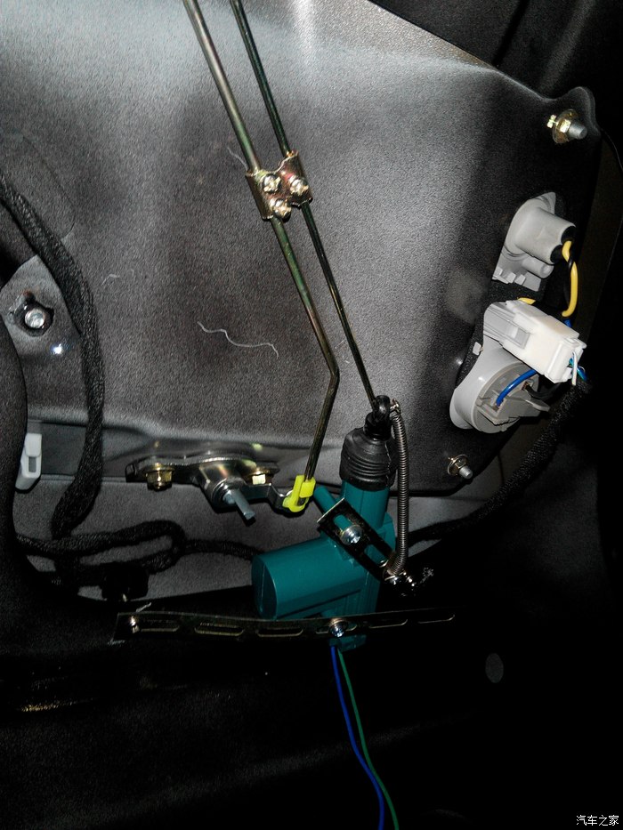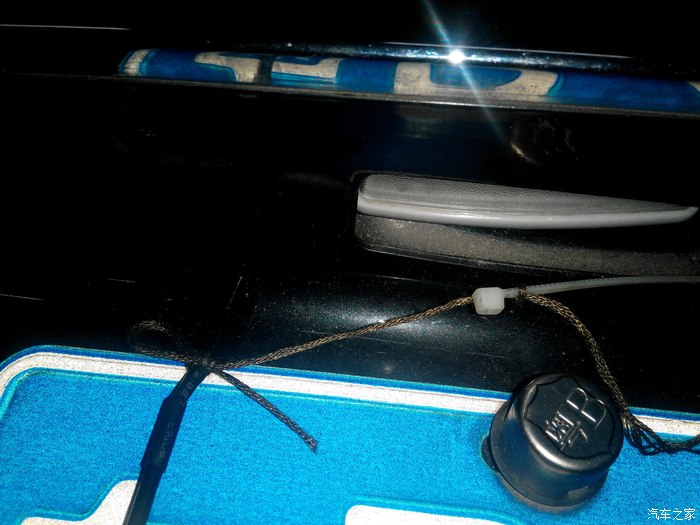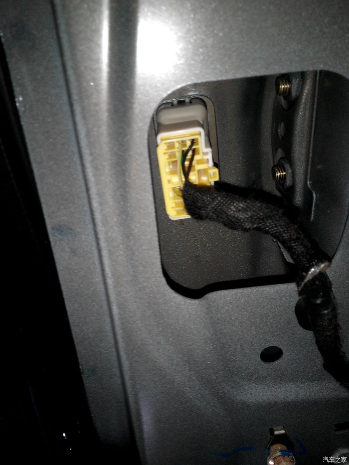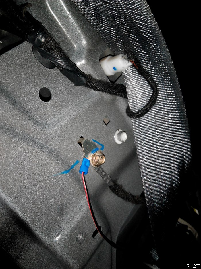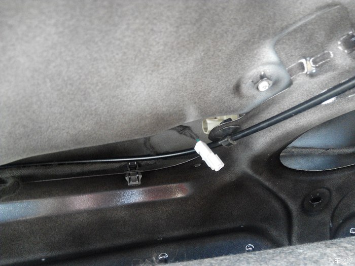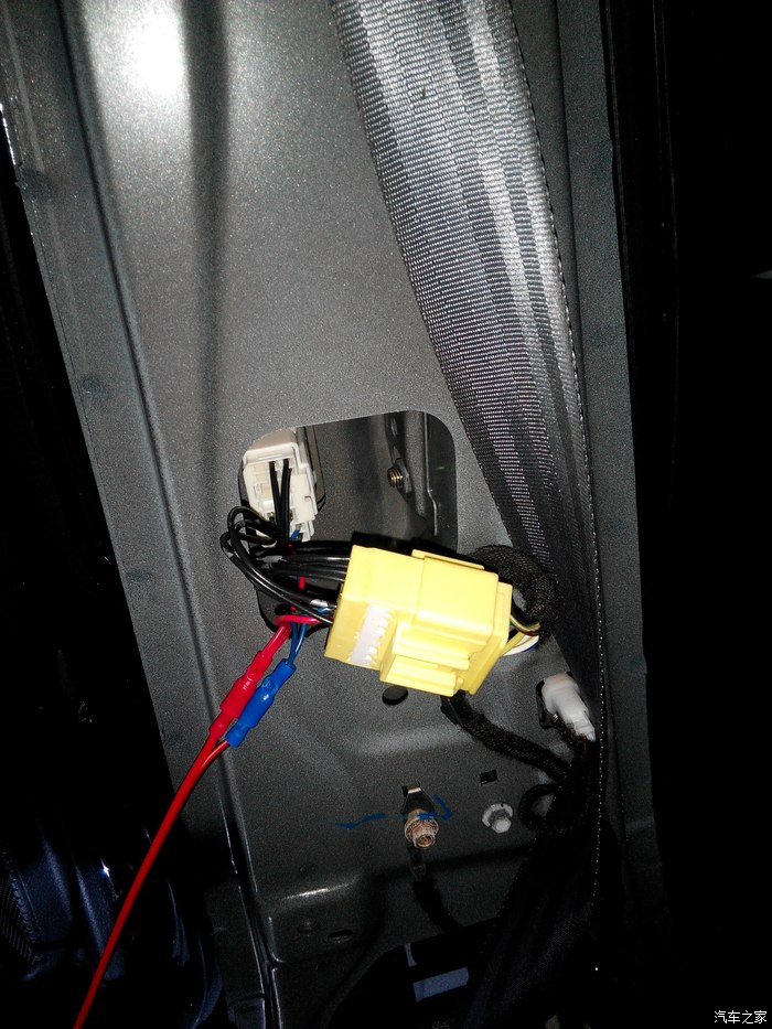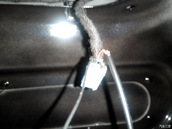布线,线束从后备箱穿到后座,拆开后门踏板的胶护板,拆开左侧B柱内侧扣板,里面有一个插头