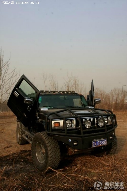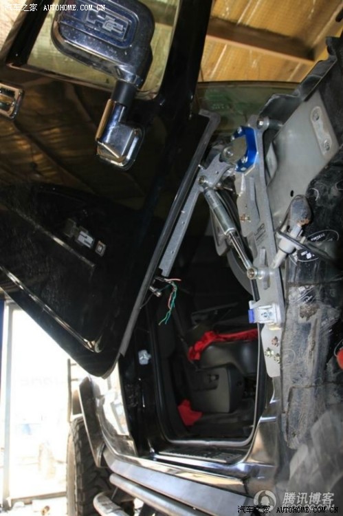 6.将气弹簧安装完毕后,抬起车门,对于悍马H2这个二百多斤的车门抬起这么高确实需要两三个小伙子了,呵呵。将车门原装位螺栓孔与套件连接固定,但螺栓不要拧紧。