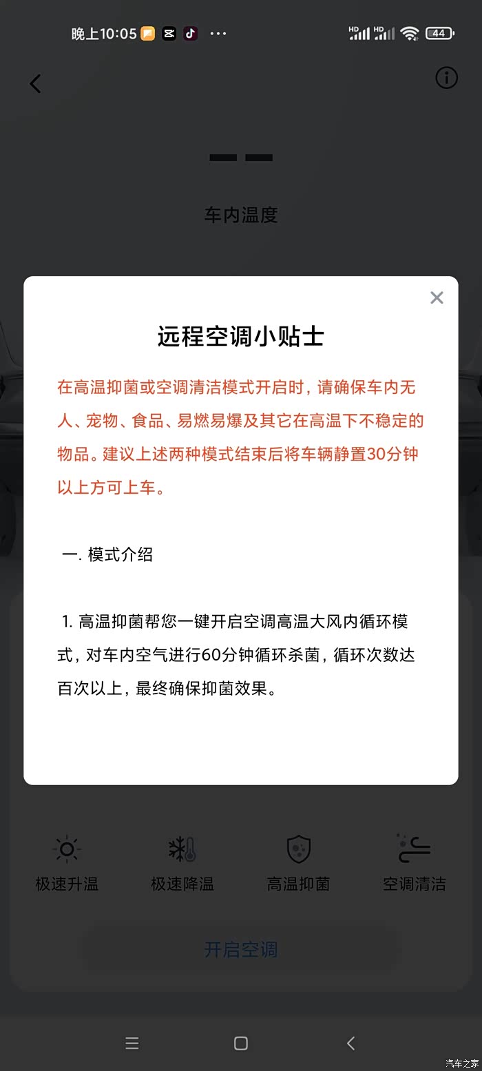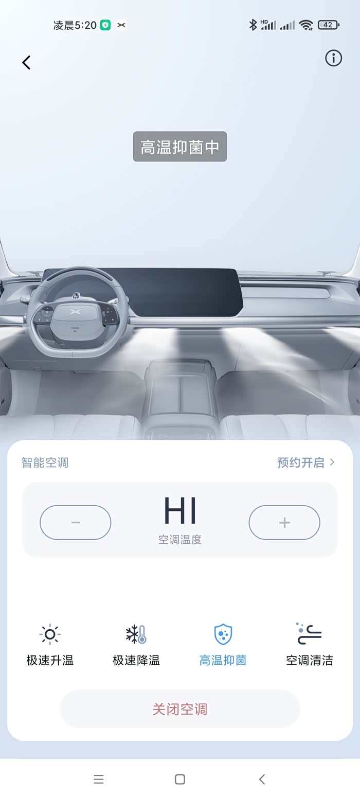 突然想起来去什么洗车店,咱的小P不是自带这功能吗?第一步,手机上打开小鹏汽车APP,第二步,远程打开空调净化,空调净化默认2小时,这个时候车内温度会比较高,这样吹吹车内肯定不会再湿漉漉的了。那就好好的自己给爱车来一次净化消毒保养吧,彻彻底底的。再来一个高温抑菌。60分钟的高温杀菌。预约完成。3个小时的车内保养,自动完成。而我只需要坐在家里动动手指发发指令。明天注定又是清爽干净的一天。
