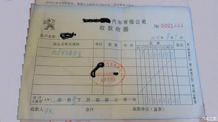 时间来到8月7日决定就508了,很快和销售基本达成一致,就是一个问题我想提5月份之后的车,销售总监出来说可以。那么就直接订车,约定8月底前拿车,付了1W订金我就等消息了。一周后来电话说只有1月份的车,排产也一时半会没有,无奈只有接受。谁叫我自己喜欢呢!我只有1个要求了:8月28日我一定要提车。就等着那一天了,按约定时间上午到车下午去就提车,我只简单看了下外观和出厂时间就交钱开走了,把车开回家交给真正的主人LD。