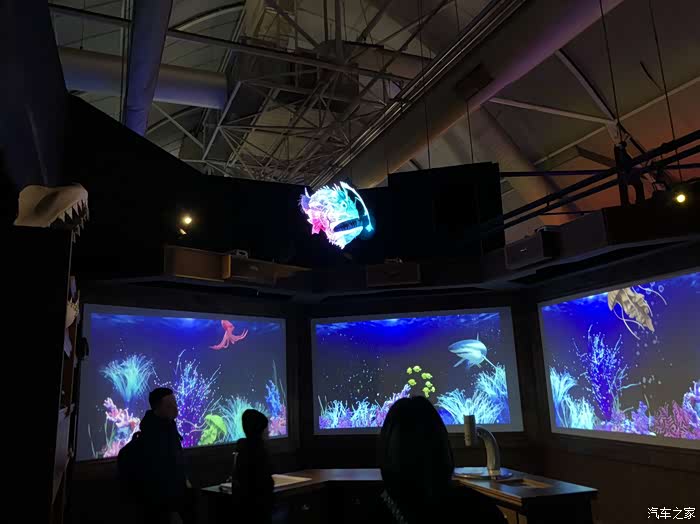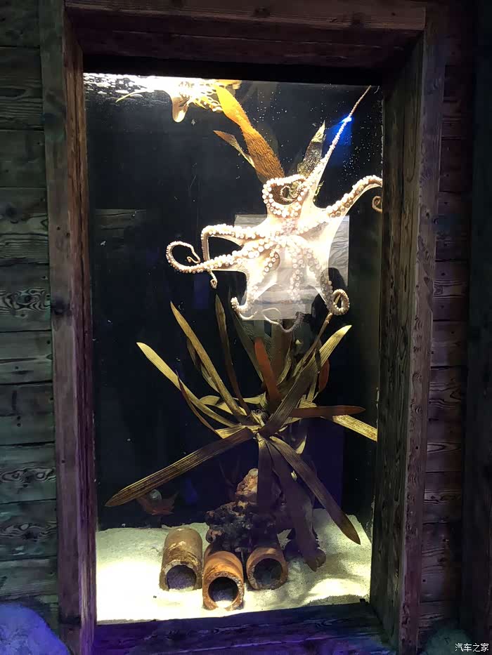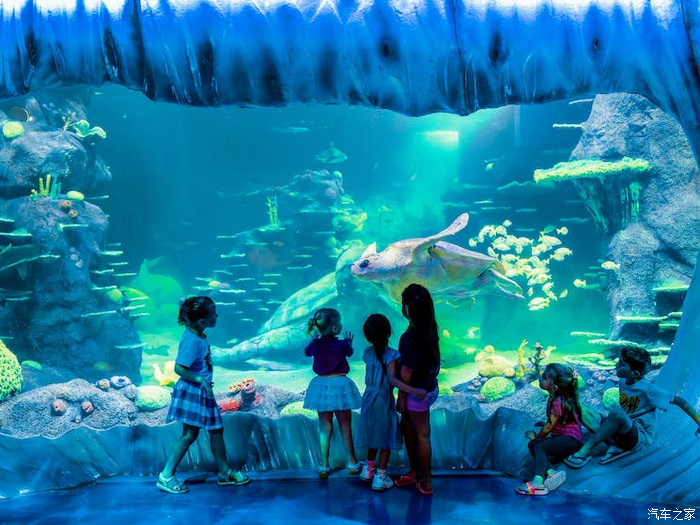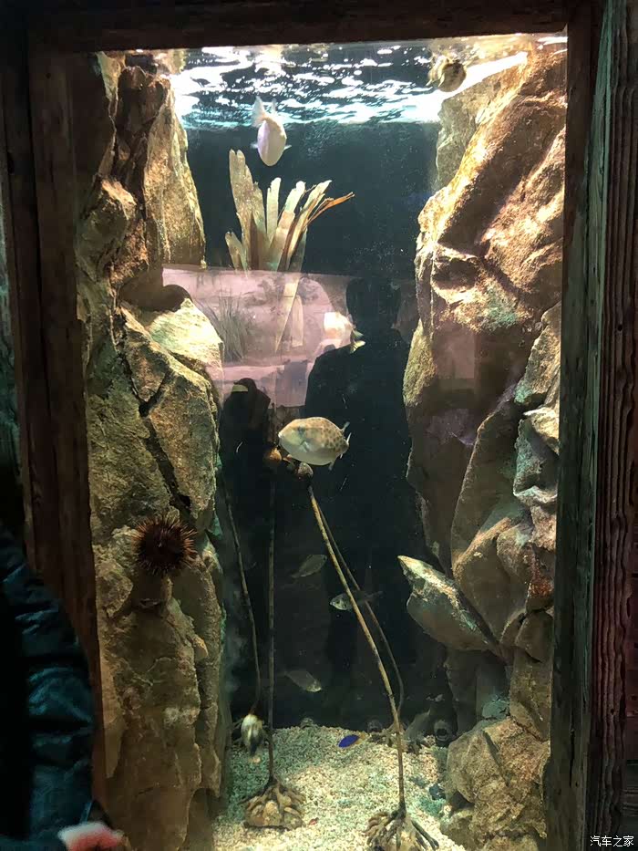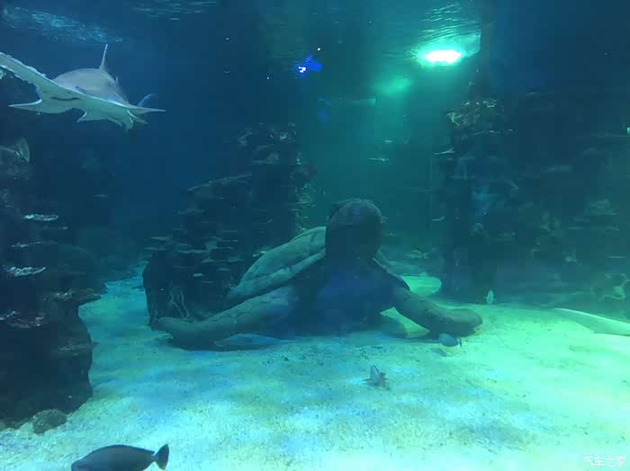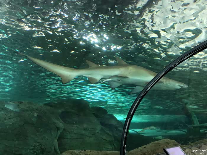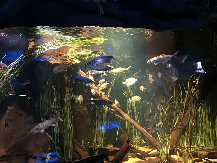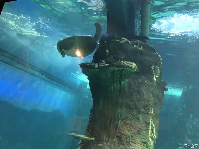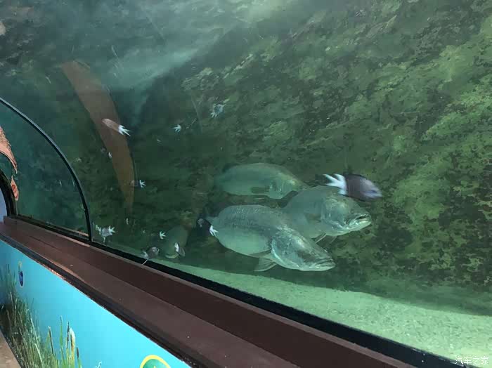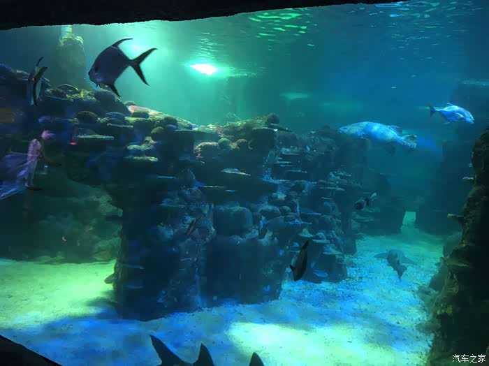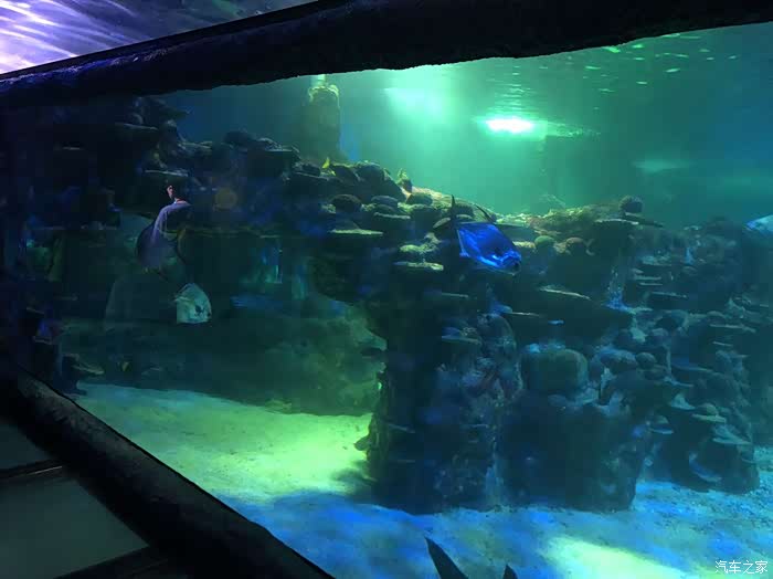 要说这里的设计还是非常独特的,一个巨大水池,可以在侧面看,可以在底下挖两个隧道向上看,也可以在上面向下看,同一池鱼,视角不同,效果不同。