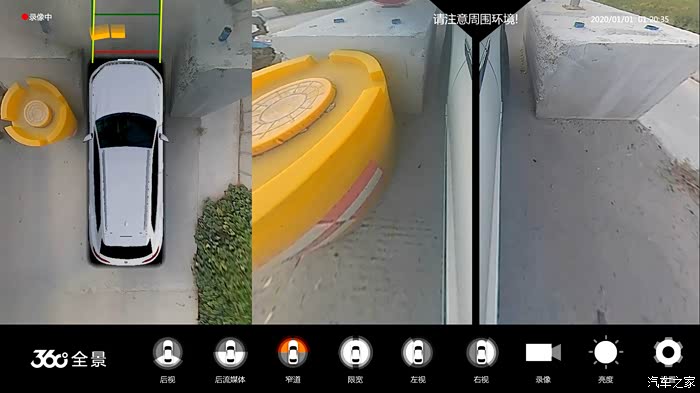 经过河堤路、村口或临时交通管制路段时,常常会遇到限宽墩等窄道路况,此时可调出 360°全景的窄道视图模式,左右前视角度同显,能看清左右前轮位置与路墩的距离状况,帮助车主轻松通过窄道,避免刮碰损坏爱车。