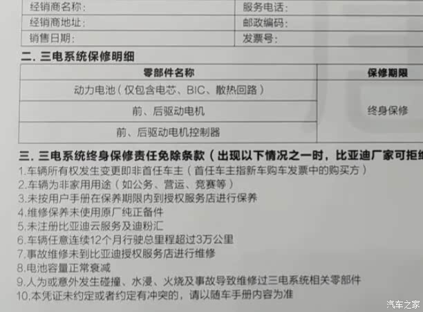 是的,针对消费者普遍关心的三电系统,比亚迪给出的方案是“终身保修”,即在规定的条件下正常用车时所发生的三电系统故障或损坏,厂家都会无偿为车主提供维修或更换相应配件等服务。当然,这个福利是有限定条件的,例如首任车主、非营运车辆等。其中有一项争议挺大的,即“车辆任意连续12个月行驶总里程超过3万公里”。也就是说,若你的车在12个月内行驶总里程超过3万公里,就终止三电终身保修服务。