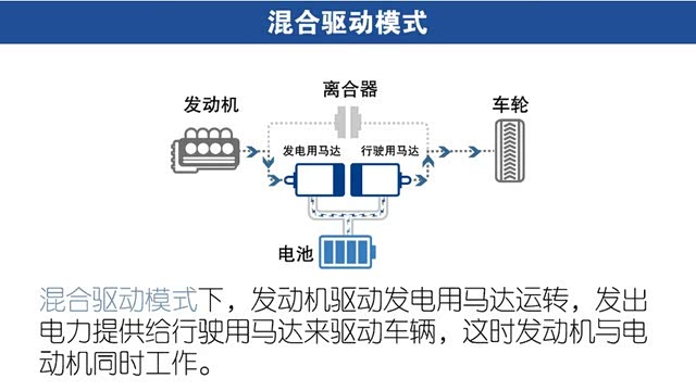 1、中低速时,发动机工作,但不直接驱动车辆,而是带动发电机进行发电,然后配合电池把能量一起交给驱动电机,类似理想ONE的增程式;