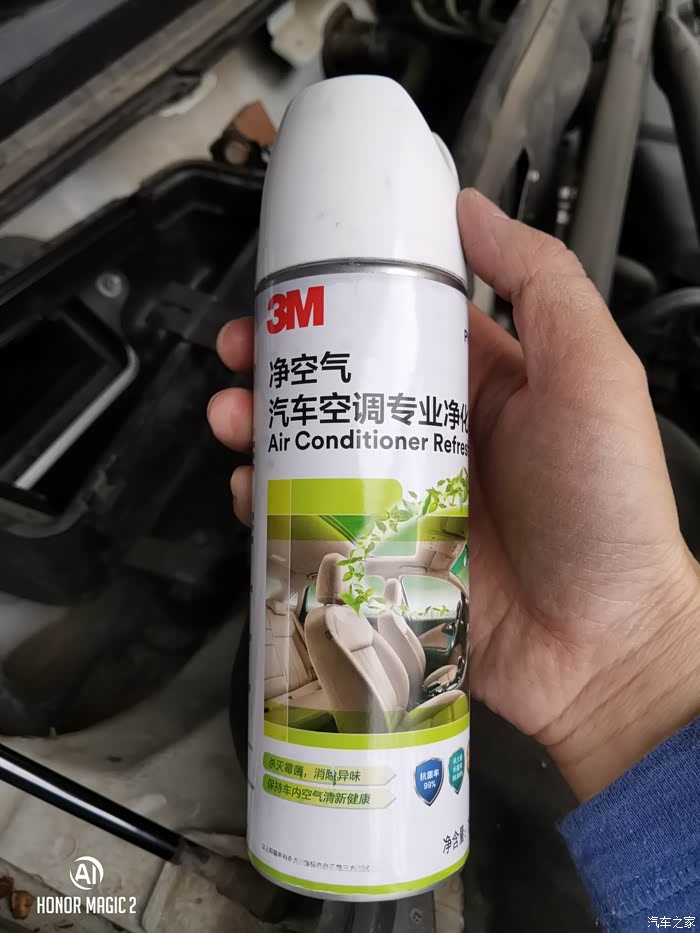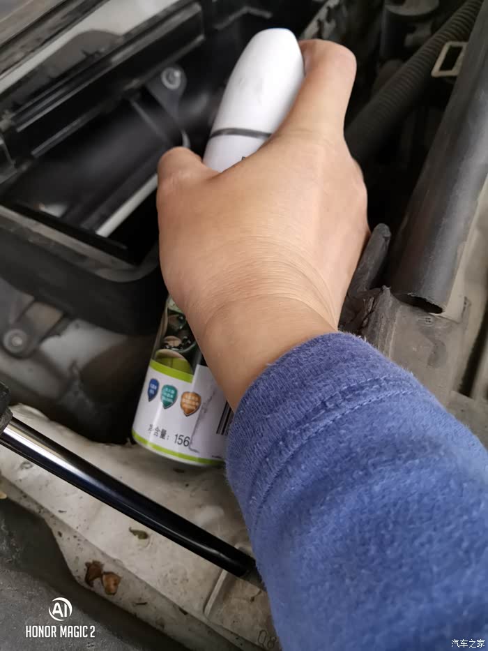着车,开AC,最大风量,关闭门窗,断续喷,花了20分钟,喷完灭车,关闭门窗10分钟,利用这个时间安装空调外虑和盖板。再打开车门装好空调内滤芯。