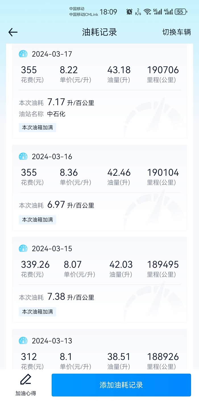 3月13日加油时,上一箱油的百公里油耗是7.36,