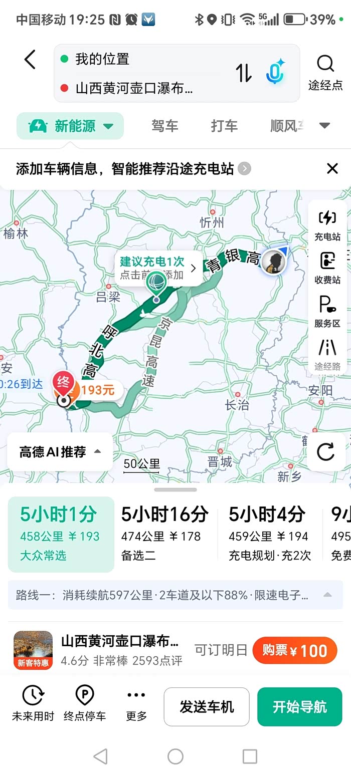 早上8点满电出发,直接导航【壶口瀑布】,250公里电量够够的。京昆高速开2.5小时到临汾市区(中途不下高速),服务区不用充电(续航够用)。在临汾市区吃碗牛肉丸子面,再开1.5小时到壶口景区。傍晚回临汾市区住,搜带充电桩的酒店,晚上补电到100%。