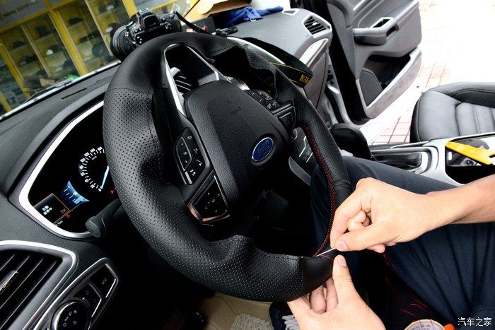 福特的方向盘通病,细~~~而且用久后容易打滑。方向盘套我最爱的是手缝的线,手感会非常的强!我有一个很坏的习惯,单手打方向盘。所以我对方向盘的防滑性要求还是有一点点高的。