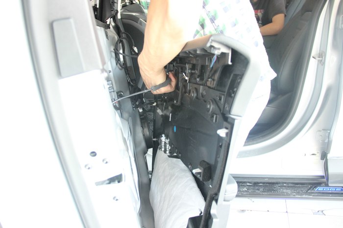 2.接下来的步骤,我们做得都是如何拆下新锐界的门板,然后将后视镜整个取下来!因为要把摄像头装进倒后镜里去!对,有车友问照地灯还能用吗?答案是,当然能!装的位置是,照地灯隔壁,它们是邻居,好朋友!