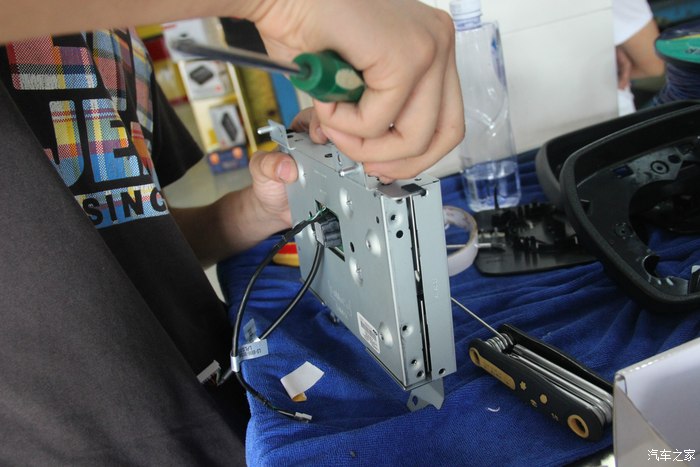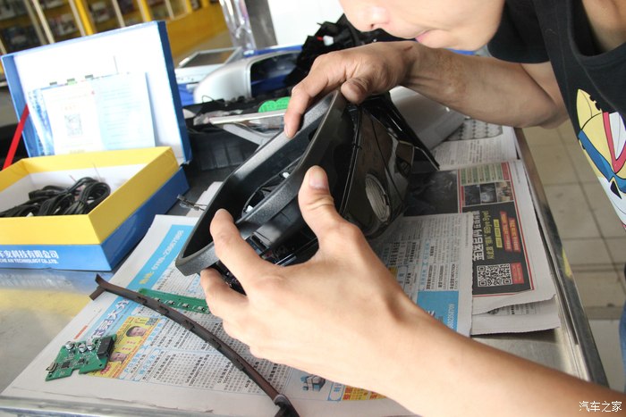 要把倒后镜拆成这样,线才能穿过来哈,虽然看着很残忍,其实知道原理就很简单的了!就是摄像头装上去后,视频线引进中控。然后与主机一对接就可以了!
