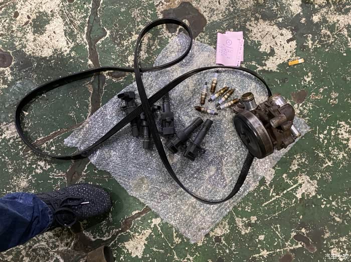 换下来的配件,火花塞积碳严重,皮带老化,高压包下面胶套硬了