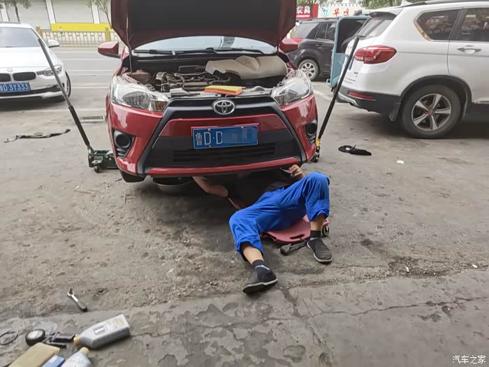 千斤顶把车抬高一些,方便钻进车底