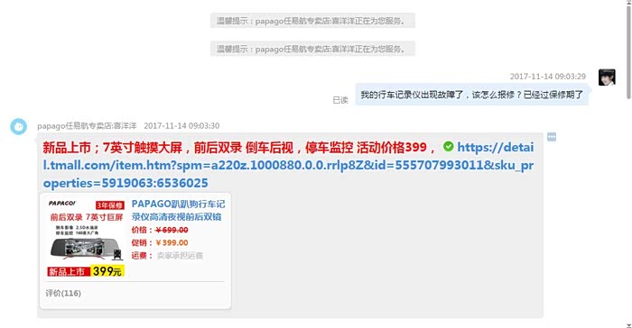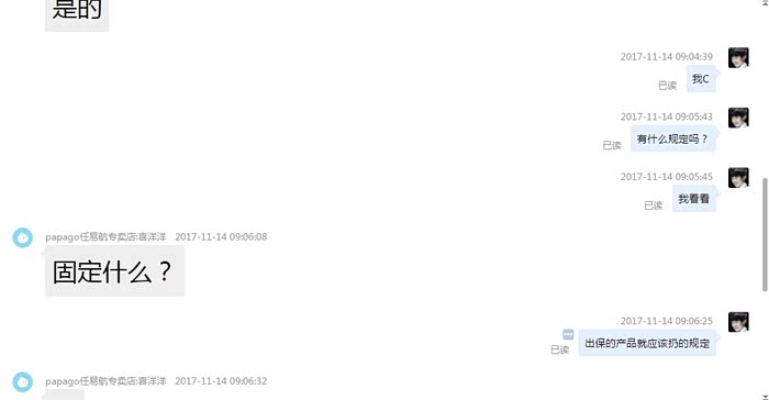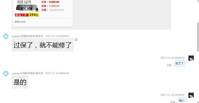 ,直到前几天机子彻底无法开机,我又了次联系了“papago任易航专卖店”的客服,客服的回答是“过保了,就不能修了”,我说“那就只有扔了?”,客服回答“是的”,有截图为证,真是无语了,不论是厂家还是经销处,完全没有给你解决问题的态度。