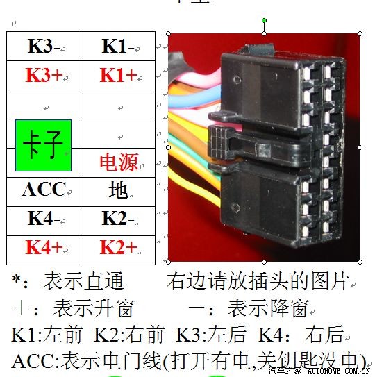 轩利近日联系说,只要能提供线位图,他们就能出专用的关窗、开窗器。主要是主驾门板内控制窗户玻璃升降结束的插头的具体线位。如下面这个图: