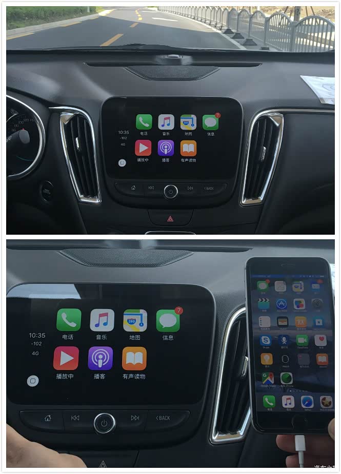 接下来是这次拍的了,请原谅在后排用手机的我,距离掌控的不是很好。这个就是手机通过数据线连接到车上之后打开的Carplay界面。它和手机界面是同步的,包括信息数、时间,以及信号的显示方式。