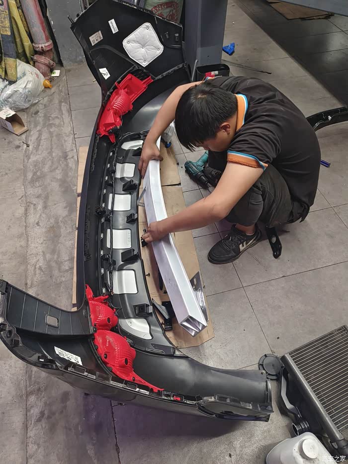 后防撞梁用的什么玻纤,看车友装了铝合金防撞梁,我也换了一个,小师傅在认真安装,点个