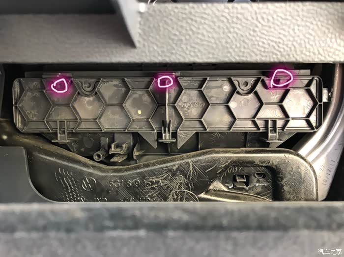 放大看,里面有个空调滤芯的保护壳,从如图所示3个圆点的位置有个卡扣,直接拆解下来