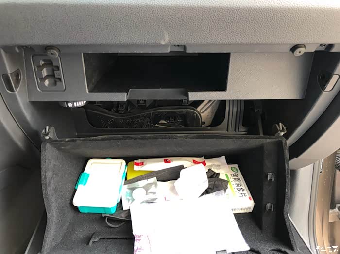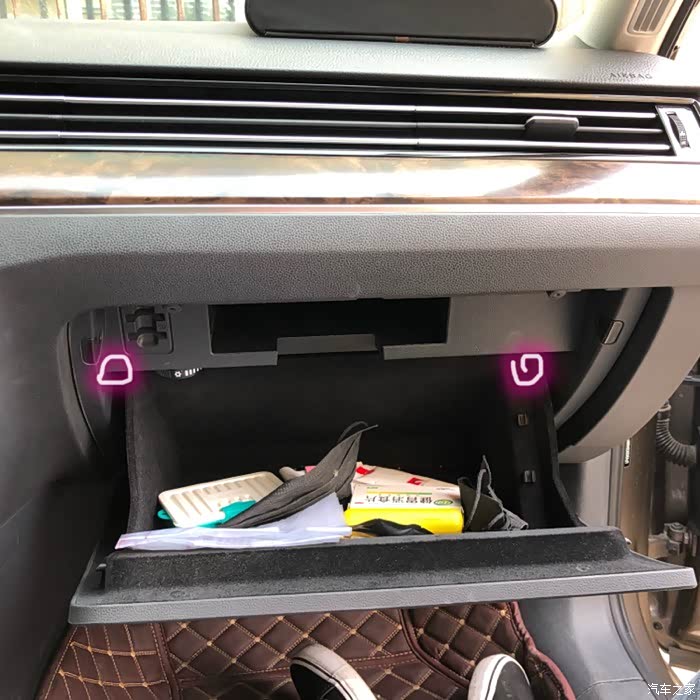 打开副驾驶手套箱,如图所示,左右俩边靠里面的位置,各有俩个卡扣,然后用手用力向上推,就拆下来了