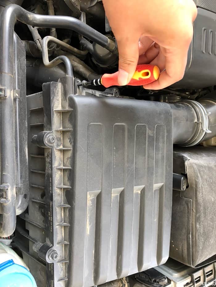 打开发动机舱,首先看到就是空气滤芯,用改锥依次将围绕的八颗螺丝拆下来