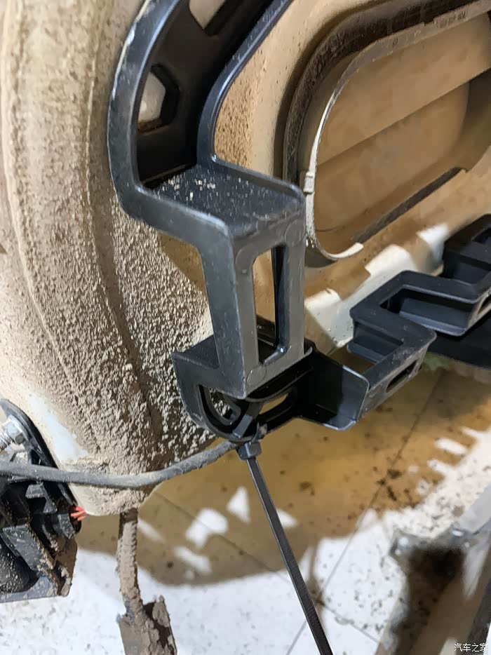 接着就是新的后保险杠支架上车。摆好位置,卡上卡扣,即可固定好,接着就是将6颗固定螺丝上丝,上完了就固定好了。同时,在这里绑定的盲区检测线也要用轧带扎好,避免因为碰撞摩擦再次引起异响,然后那就是有一次的拆卸和安装了。