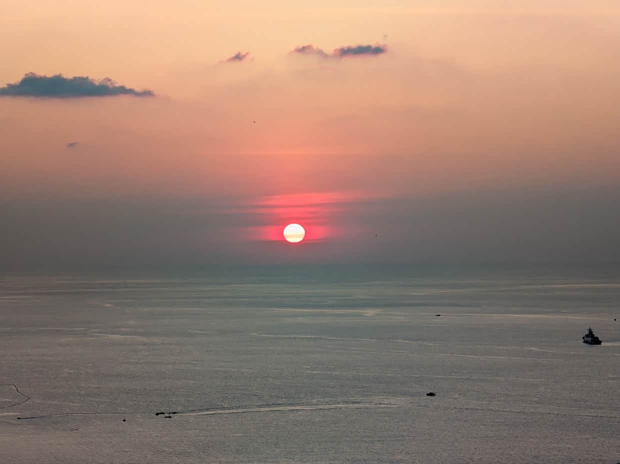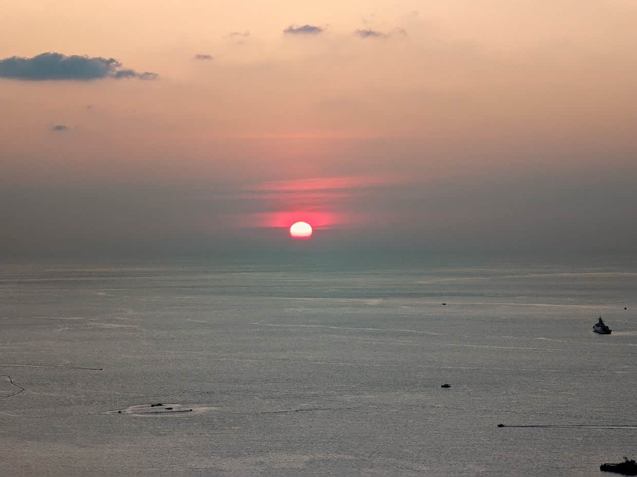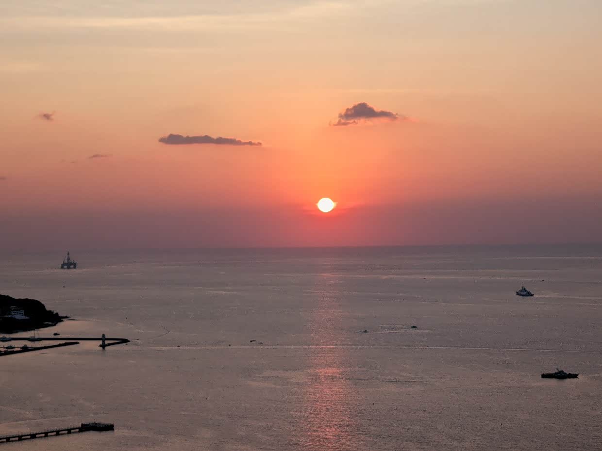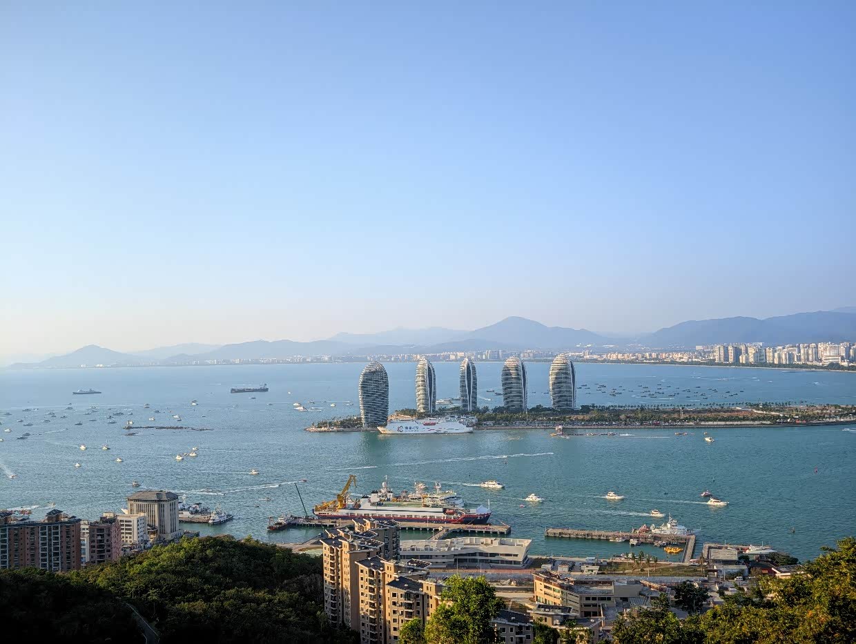 站在山上眺望,大海和城市共同构成一幅随时变换着色彩的画卷,有高楼林立,有大桥飞架,有渔舟唱晚。