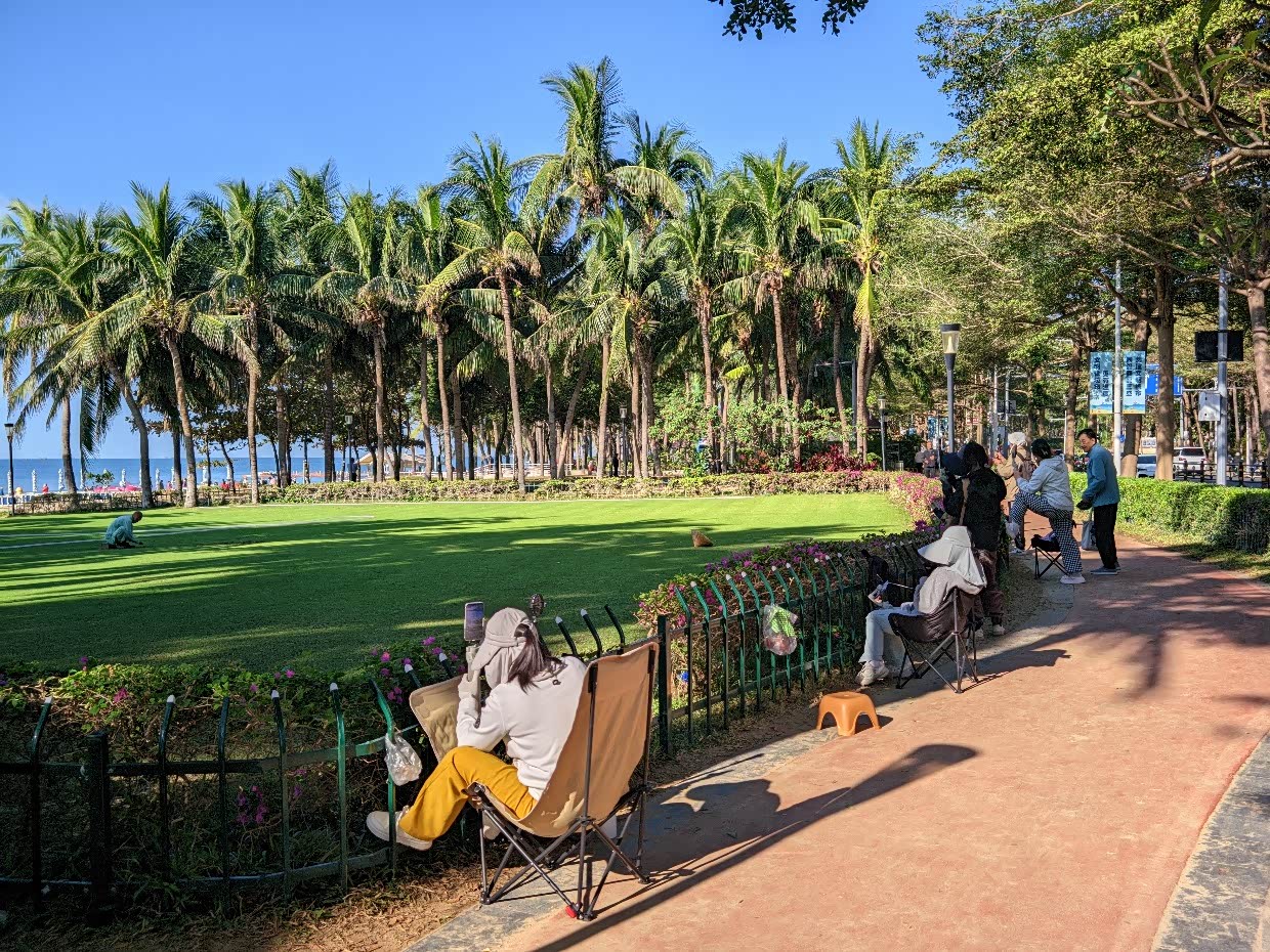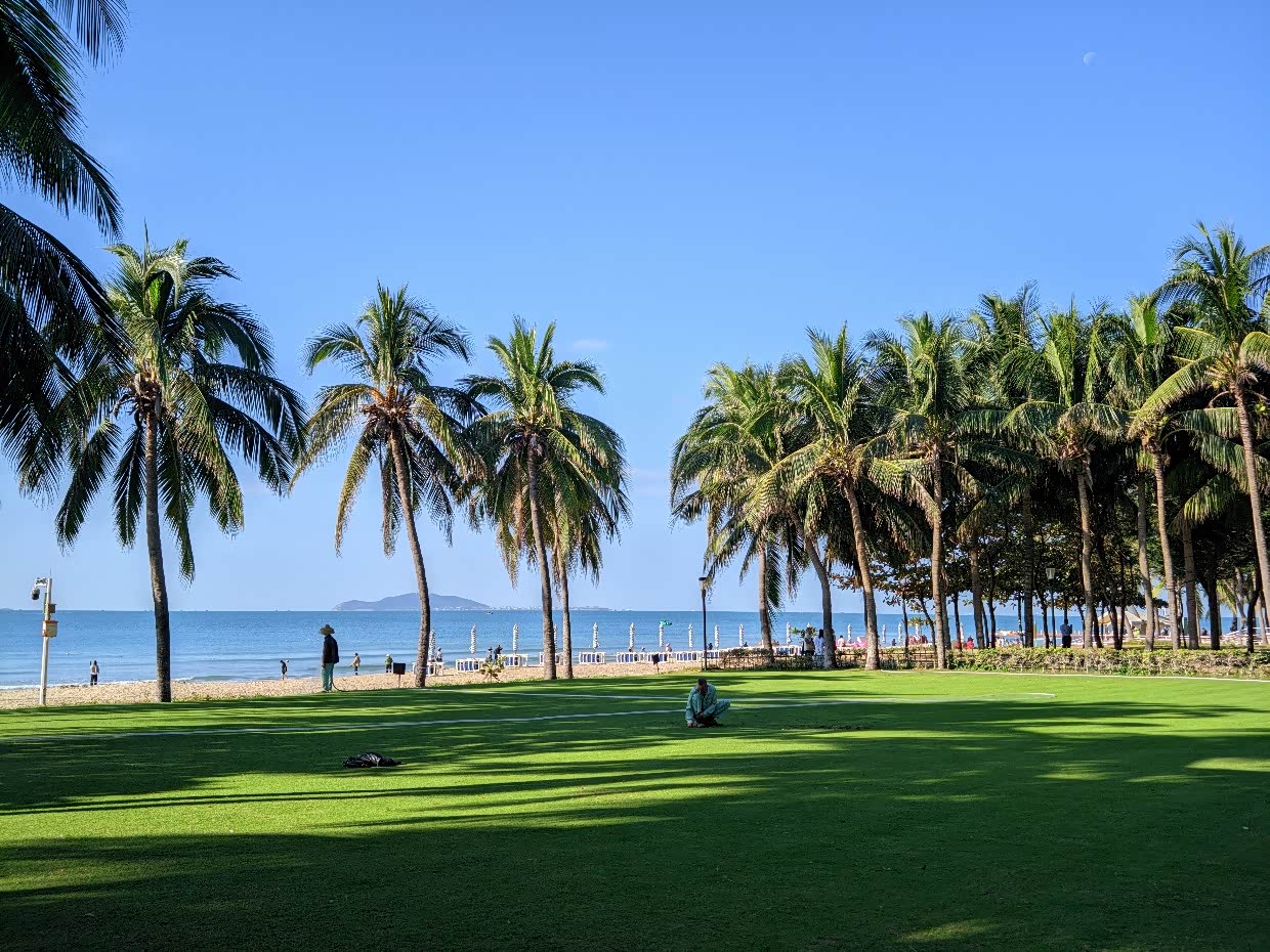 海韵酒店对面的大草坪是传说中的椰梦长廊最佳打卡位置,草坪、沙滩、大海同框,很好出片。