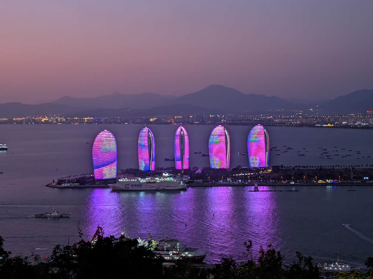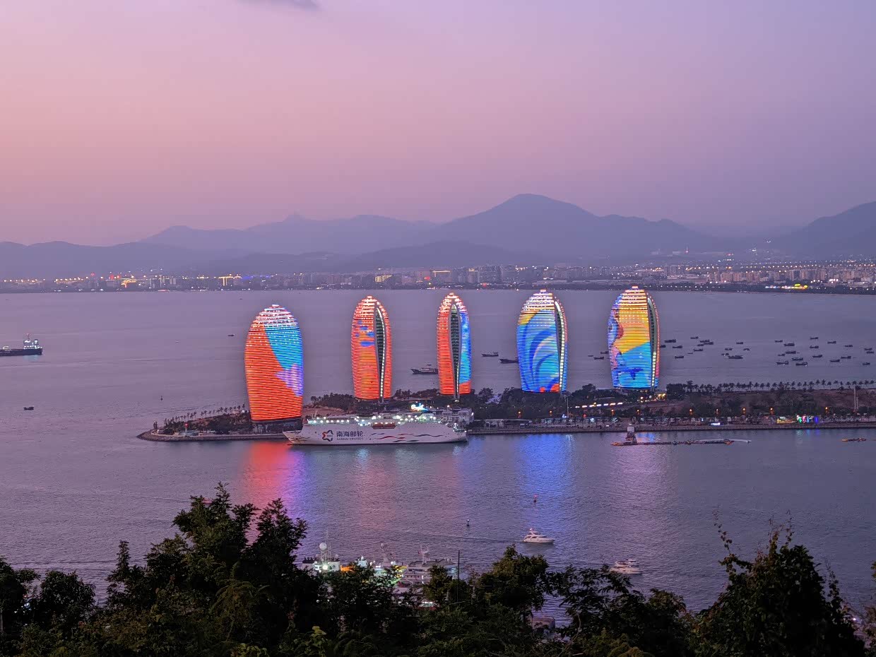 凤凰岛上的五座标志性建筑一目了然,它们线条流畅,如扬起的风帆,又好像待开未开的蚌壳,带着几分动感。