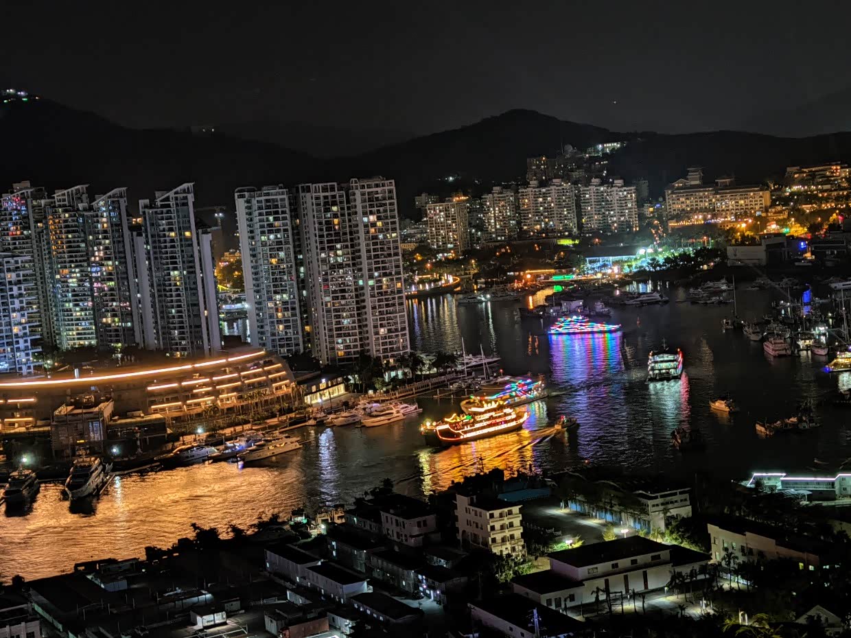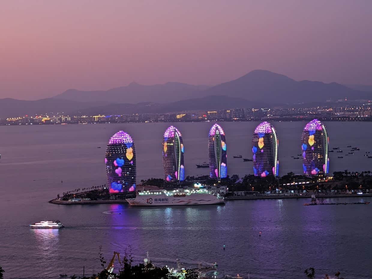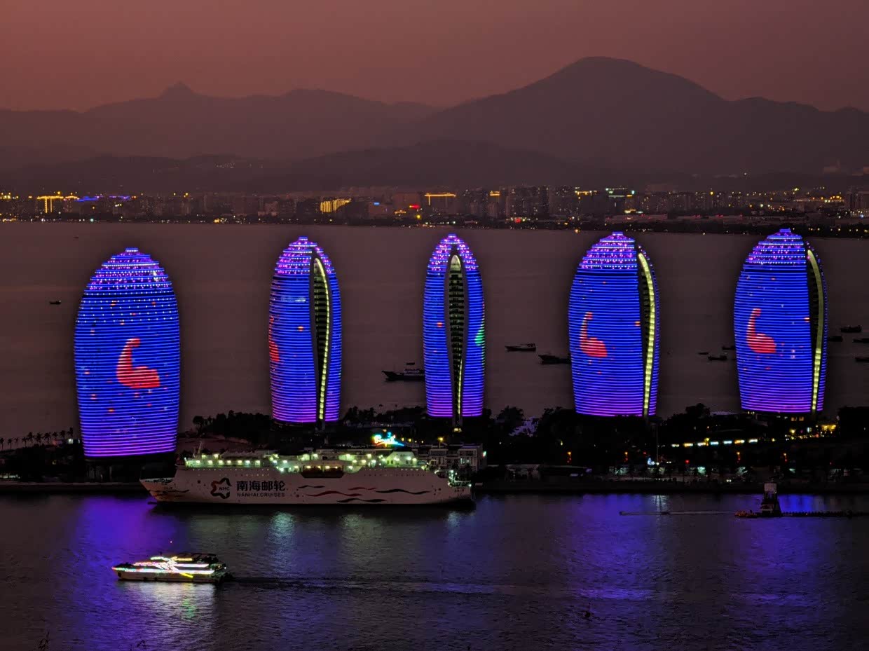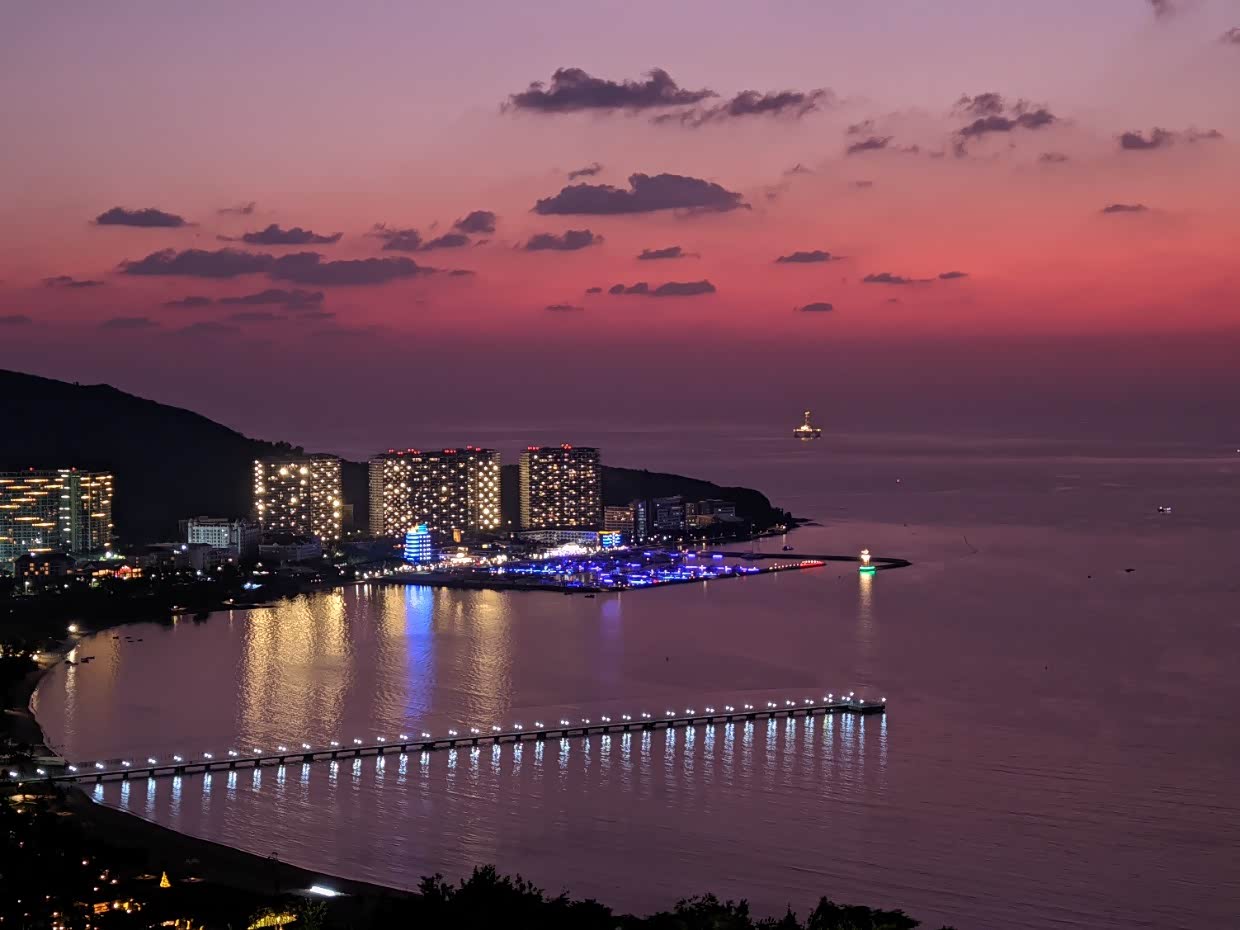 待夜幕降临,三亚的城市灯光如星河般点亮海岸线,美不胜收。