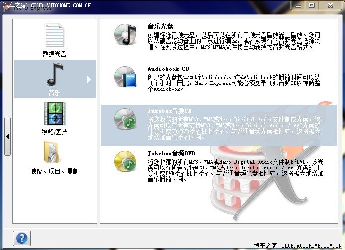 这是Nero8的Nero Express启动介面,在左边菜单选择“音乐”,在右边菜单选择“音乐光盘”