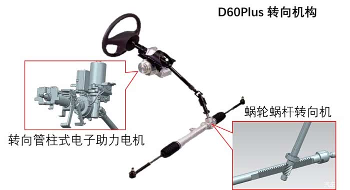 我们首先从操作便利性和直行稳定性说起,D60采用了电子助力蜗轮蜗杆转向系统,正如其名所述,由于才用了电机进行转向助力,所以工程师可以通过调整转向电机输出的电流值大小,实现对全速域,全角度的转向手力调整,使车辆在不同的车速和方向盘的转角有着不同的助力特性。