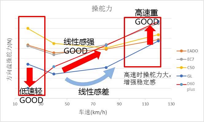 首先是操作便利性,因为我们的车辆70%的时间都是作为客户的通勤车辆在市区中窜梭,通过调研发现城区道路需要多次转动方向盘场景居多,例如停车入库,低速转弯还有堵车情况等,而且我们的客户群体中也不乏女性客户的存在。因此在调校操舵力大小的时候,我们就考虑将D60 Plus调校成在低速状态下客户可以轻松便利的转动方向盘调整车辆方向。这就需要发挥电子助力转向的特长,调校团队将原地及低速的转动方向盘时的电机电流加至最大值,从而尽可能地降低转动方向盘的手力。通过调校团队的努力,目前D60 Plus在竞品水平中是最轻的。