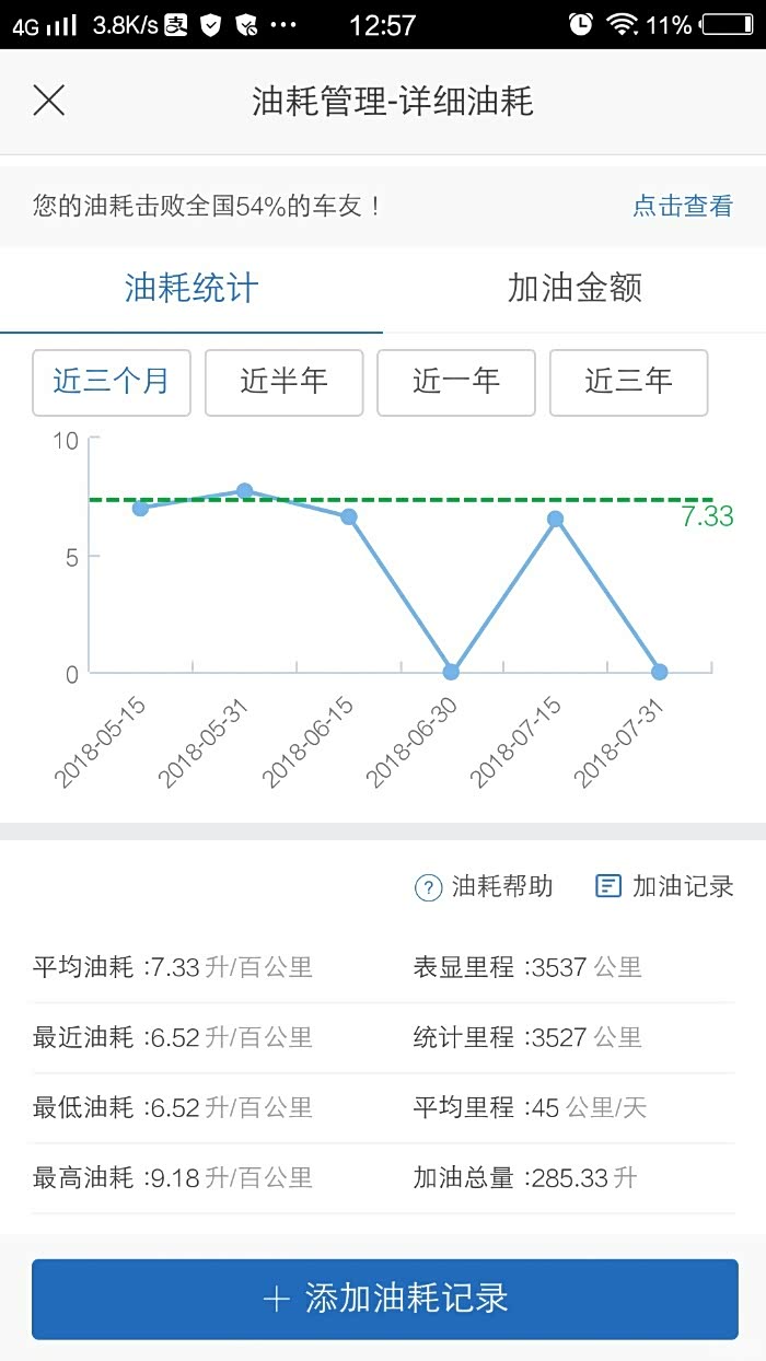 这是用汽车之家油耗记录表得出的结果,实际油耗如上次不断的话,基本上与车子上的综合油耗很接近。