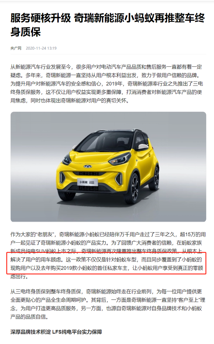 严重虚假广告:奇瑞未履行”2019款小蚂蚁自动升级整车质保“。