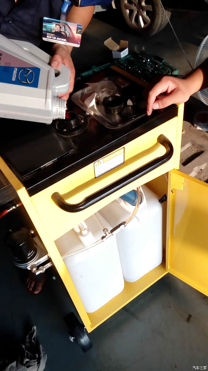 上面这图,是循环机 出来的旧油,尺度显示大约4.7升,如果不用循环机,这些油就和新加的4升油一并复合使用了。
