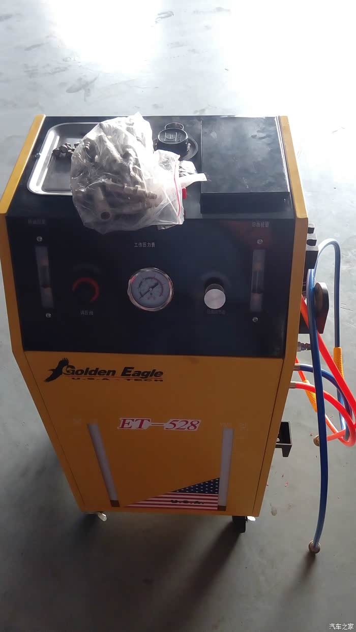 3、最费事、花费大、最彻底的办法: 按第二条办,之后再用自动变速箱换油循环机,顶出来变速箱里面的旧油,这样,大约要注入10升左右,加上过程和循环机的损耗大约要11升。