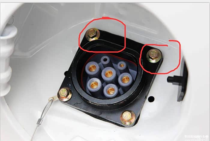 现在针对特来电的慢充桩重点讲解下,此处敲黑板~~~~~。特来电的慢充,目前车友反馈问题主要是以下2点,第一,慢充枪根本无法插入,或者是能插入,但是接触不良。这里的问题并不是说云100S的充电口不符合国标,其实是符合的。但是这个众泰设计师脑残的是,给充电插口设计的有问题,也就是说插口附近的那圆弧型的铁片,会卡住充电枪,想解决这个问题,并不难,拆下慢充口附近的4个螺丝,在我画红圈的那个位置,每个垫上3个垫片,再拧上螺丝,完美解决充电枪卡住问题。