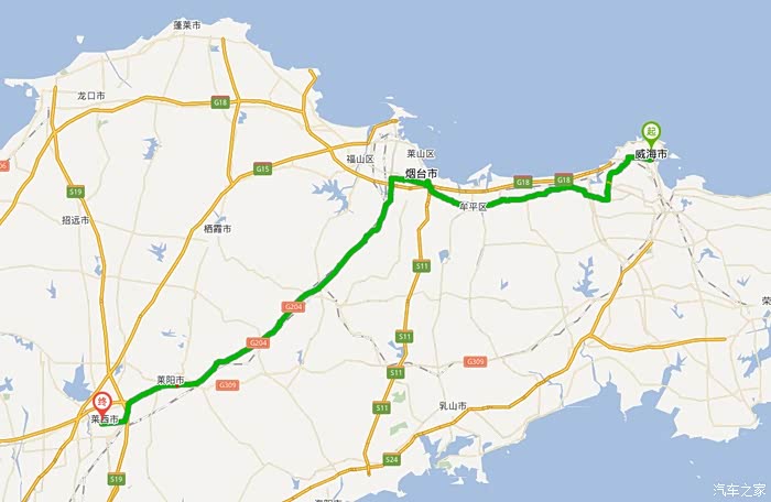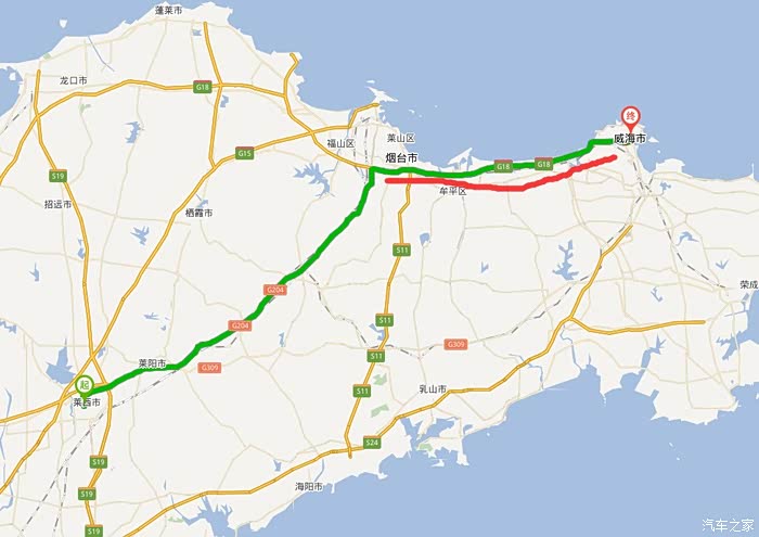 回程路线,不准备全程高速,只选择烟台到威海这段大概80公里跑高速。回程国道不描述了。