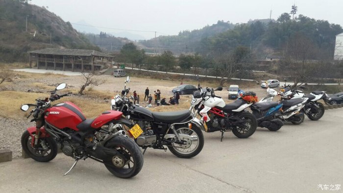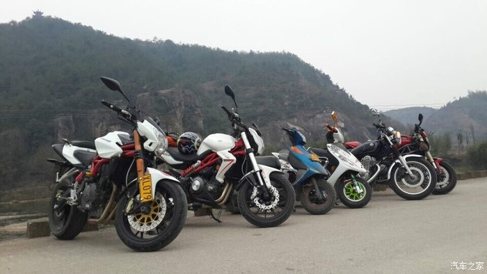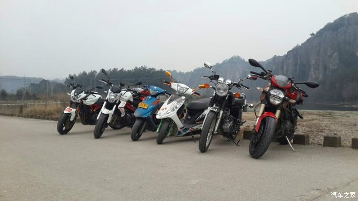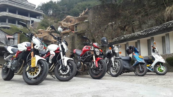 汇合后,带兄弟们到凤凰山庄玩,先拍个集体照,从左到右给各位看官介绍下这车压弯的坐骑:马哥的黄龙600,小黑的龙宝龙300,萨瓦迪卡的杜卡迪1100EVO,我的雅马哈SR,老杜的铃木V125,小陈的光阳GJ110。